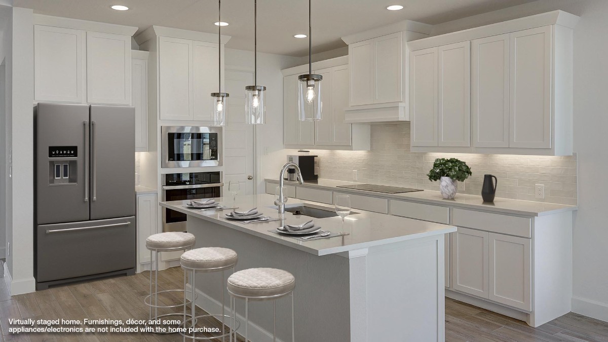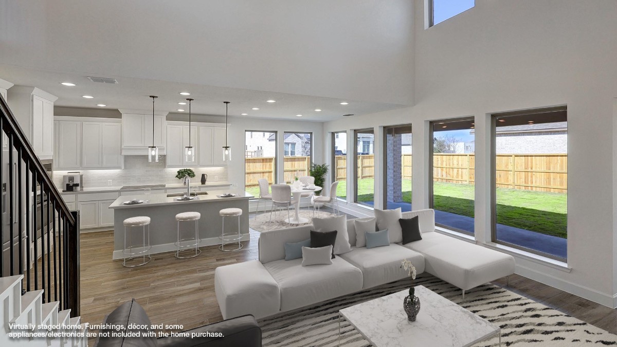 Step off the front porch into the two-story entryway. French doors open into the home office at the front of the house. Past the staircase you enter into the open living areas. The kitchen features an island with built-in seating, walk-in corner pantry, and an adjacent dining room with ample natural light. The family room boasts a wall of windows and 19-foot ceiling. The primary bedroom has coffered ceilings and three large windows. French doors open into the primary bathroom which showcases a glass-enclosed shower, dual vanities, a garden tub, and an oversized walk-in closet. Upstairs on the second floor you are greeted by a large game room with a wall of windows. A private guest suite with a full bathroom is off of the staircase. Secondary bedrooms featuring walk-in closets, separate linen closets, and a shared bathroom complete this floor. Covered backyard patio and 5-zone sprinkler system. Mud room and utility room are off of the two-car garage.
