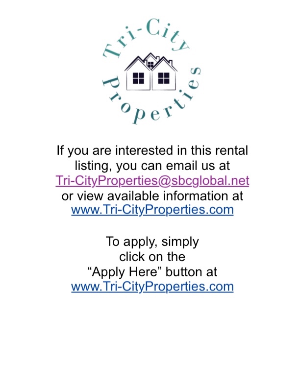 Posting for Tri-City Properties. All inquiries can be emailed to TCAvailableProperties@gmail.com. Check out more information and photos at www.tri-cityproperties.com. Do not disturb current occupants.