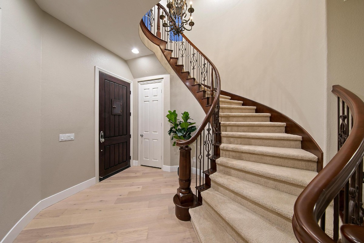Experience elevated coastal living in this spacious, two-story home located in the highly desirable Encinitas Ranch community. With serene backcountry views and subtle ocean glimpses, this home offers a bright, open feel and exceptional privacy. A grand entry foyer welcomes you with a dramatic dark wood spiral staircase featuring wrought iron railings, complemented by luxury vinyl plank flooring that extends across the main level. At the heart of the home, a central courtyard floods the great room, formal dining room, and expansive bonus room with natural light, perfect for both everyday living and entertaining. The formal dining room seamlessly connects to the gourmet kitchen through a convenient dry bar and walk-in pantry. The kitchen is equipped with granite countertops, stainless steel appliances, an impressive 8-burner range, and a wine cooler ideal for the culinary enthusiast. Upstairs, you’ll find four generously sized bedroom suites, each with its own private bathroom, along with a second bonus room, a loft with a built-in tech desk, and a spacious laundry room. The primary suite serves as a true retreat, featuring a private balcony with canyon and trail views, an oversized walk-in closet, and a spa-inspired bathroom complete with a Roman soaking tub and dual-head shower. Enjoy morning strolls and evening walks along scenic nature trails just outside your door. Ideally located within the Encinitas Ranch Golf Course community, this home offers convenient freeway access and is just 2 miles from world class beaches.