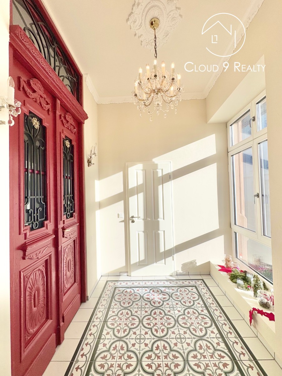 From the moment you enter, you are greeted by a grand foyer featuring stunning original tiled flooring, setting the tone for the exquisite details that follow. The preserved real wood flooring and a beautifully restored wooden staircase reflect the rich history of the home, while the striking red entrance door to the living area—over 100 years old—adds a unique touch of character.