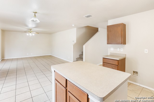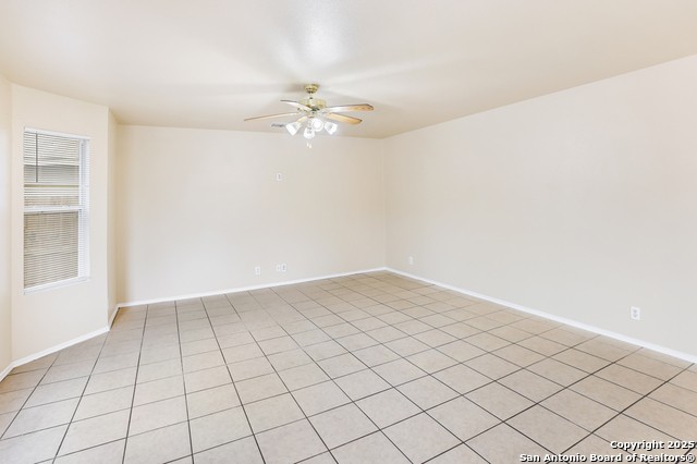 This spacious two-story home in the Champions Park subdivision is freshly painted and ready for move-in. The first floor features a formal living and dining area with ceramic tile, offering plenty of space for entertaining or family gatherings. The kitchen includes a center island, ample cabinet storage, and a large walk-in pantry, making meal prep easy and organized. Upstairs, brand-new carpeting flows throughout a generous family room-perfect for movie or game nights. The laundry room is conveniently located on the second floor. The primary suite features a recessed ceiling with crown molding, a ceiling fan, and a cozy sitting area ideal for reading or a home office. The ensuite bath includes a single vanity, tub/shower combo, and a spacious walk-in closet. Step outside to a private backyard with a patio slab and full privacy fence, perfect for relaxing or hosting friends. Conveniently located near Lackland Air Force Base, major highways, Northwest Vista College, SeaWorld, shopping, and dining.