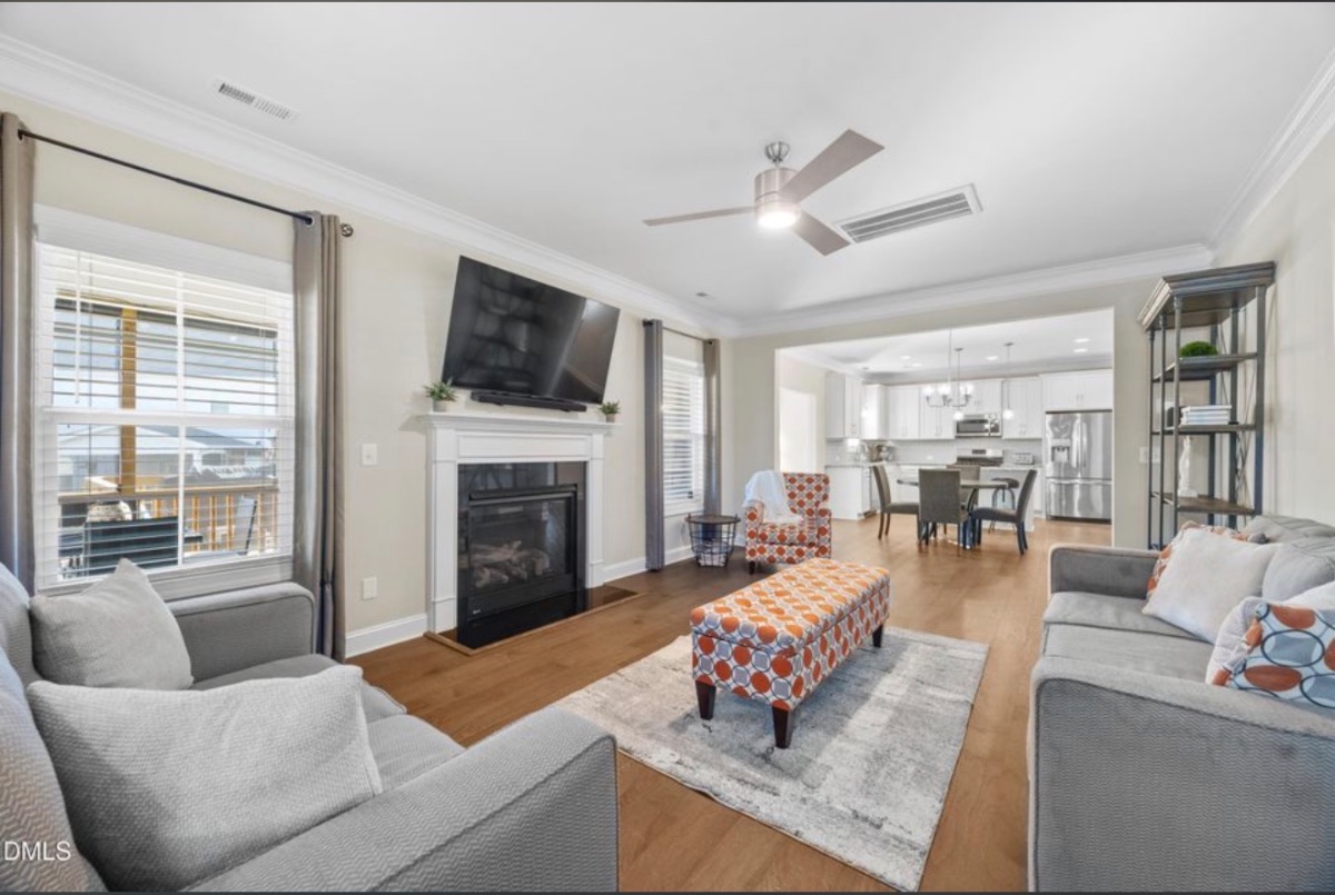Welcome to this stunning 3-story home in the desirable North Lakes community of Fuquay-Varina! This spacious 5-bedroom, 3.5-bath home offers an open floor plan designed for modern living and entertaining. The main level features seamless flow between the kitchen, dining, and living areas, enhanced by stainless steel appliances, a butler's pantry, and a walk-in pantry, making hosting and everyday living effortless.