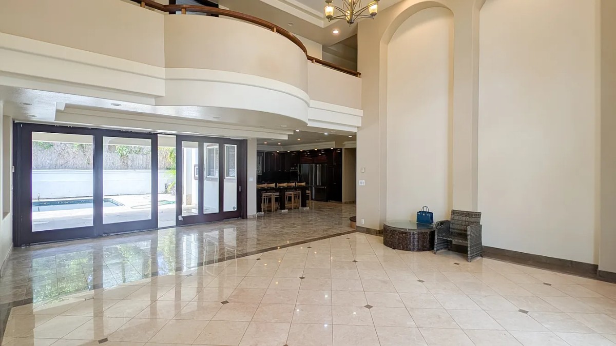 The home features an open living and kitchen area, along with separate dining and family rooms. Sliding doors lead to a private pool area with a covered patio and outdoor seating space, well suited for everyday use or gatherings. Two bedrooms are located on the first floor, with additional bedrooms upstairs. The primary bedroom includes a walk‑in closet and jacuzzi tub.