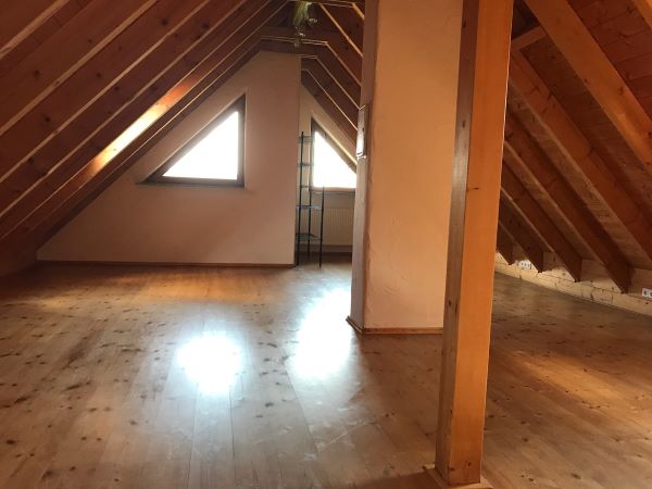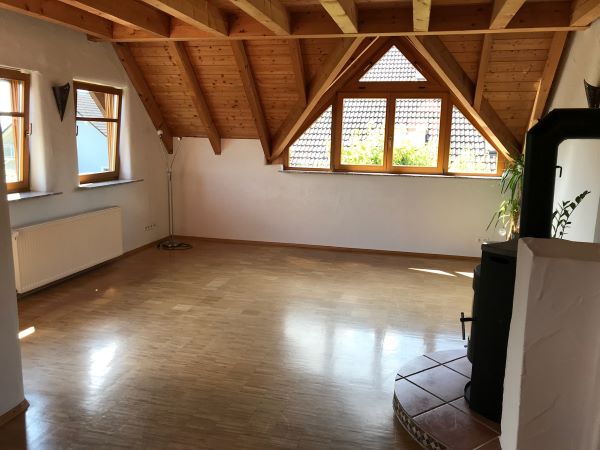 Top floor apartment is larger with two floors and has 3 BR and 1.75 BA. It has stairs leading to a large, landscaped, fenced-in yard, as well as a large balcony with a view of Ramstein village. Hardwood floors and exposed wooden beams give this apartment character one normally lacking in a rental property.
