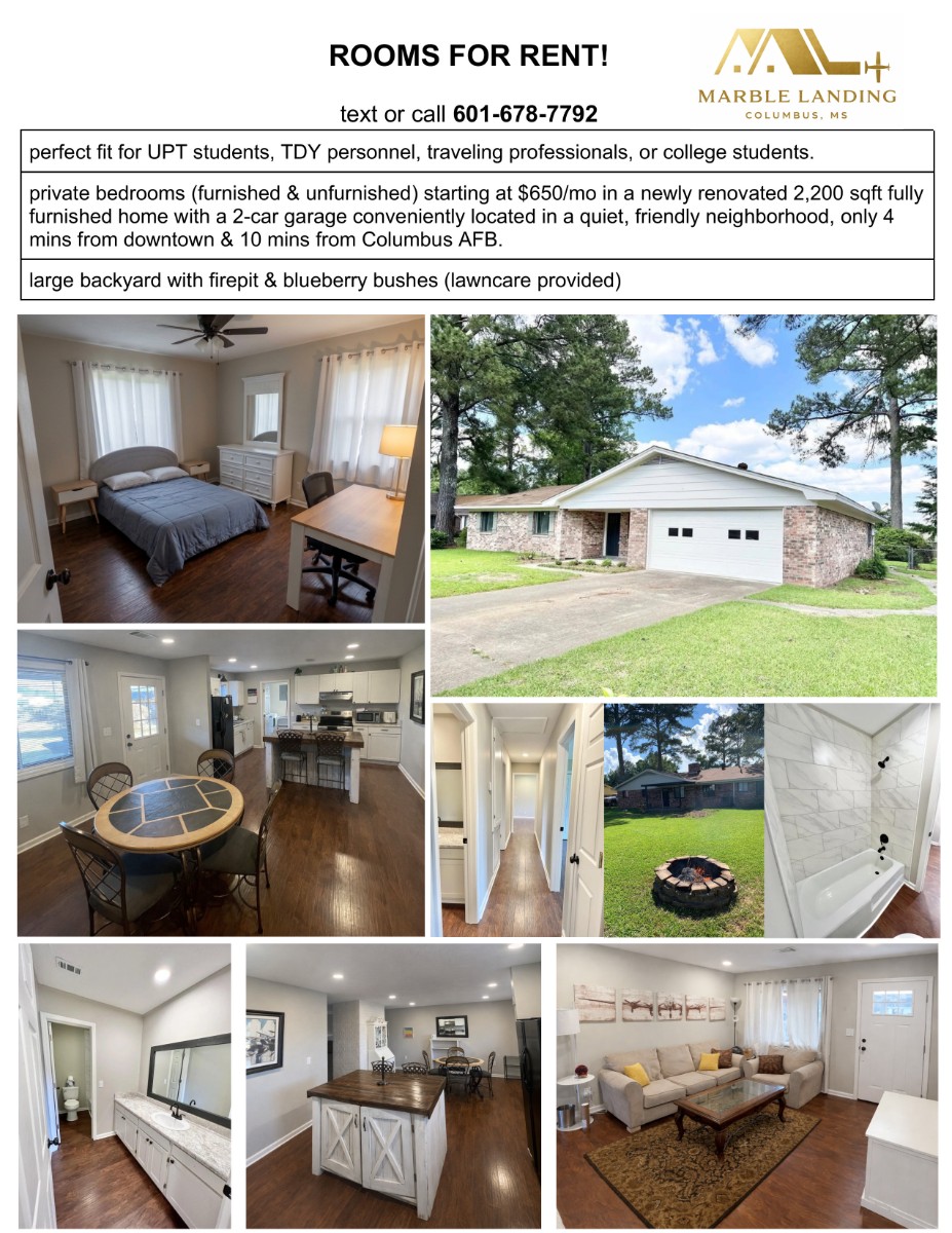 This newly renovated, fully furnished home/crash pad offers four spacious private bedrooms in a clean, quiet, and well‑kept neighborhood. It’s ideal for UPT students, TDY personnel, IFF students, DoD/military members, traveling professionals, contractors, nurses, or anyone needing a comfortable, hassle‑free place to stay near Columbus AFB or major employers.