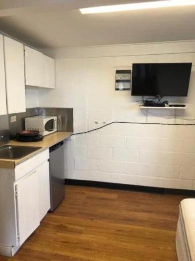 Kitchenette without a range/oven. May have microwave, toaster or hot plate. Has refrigerator/freezer, tv with basic cable and wifi (Spectrum). Share washer and dryer.