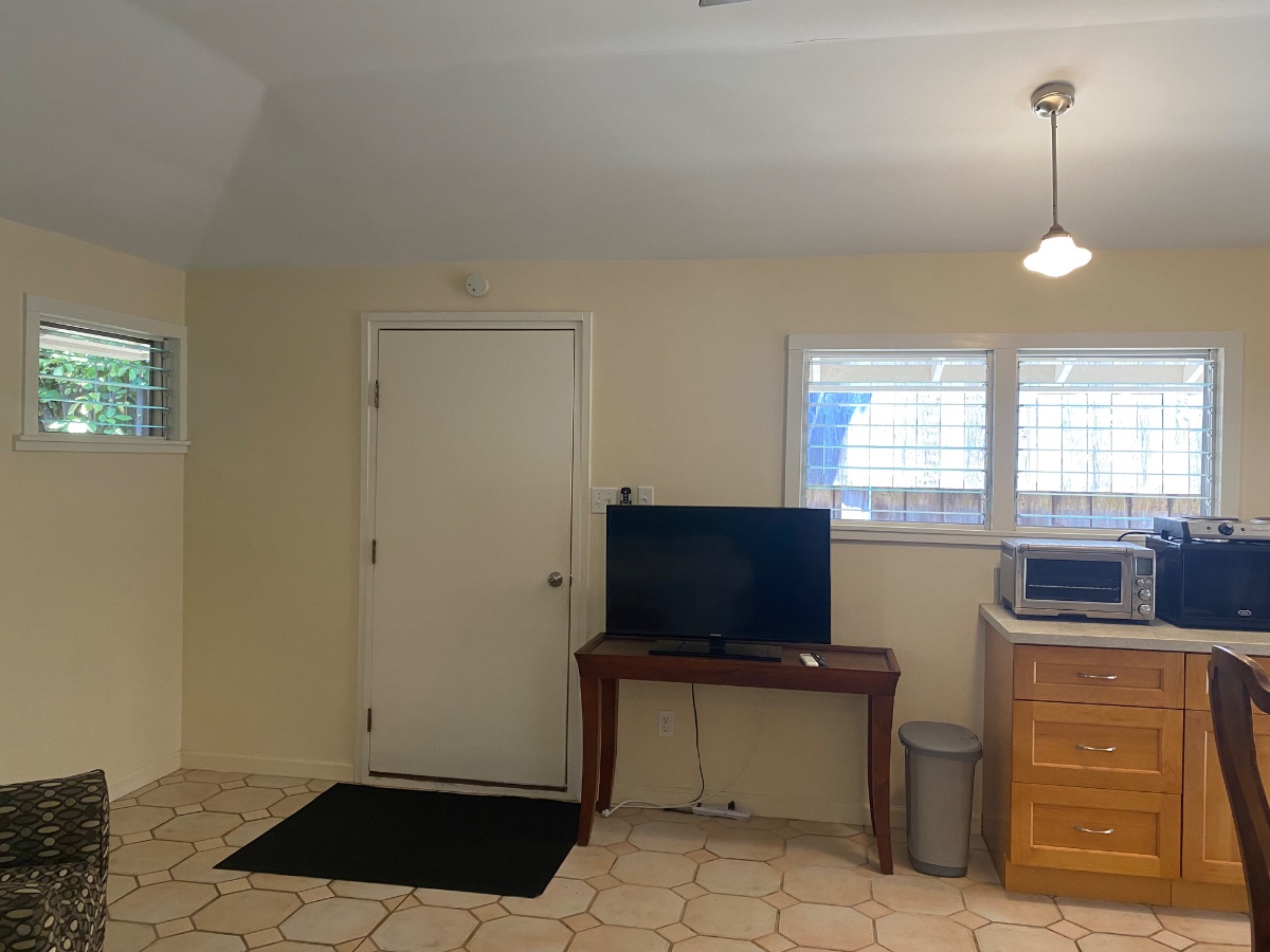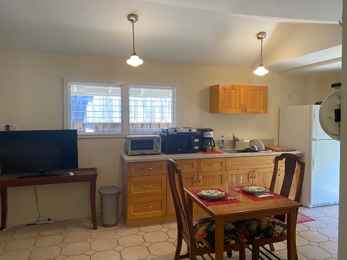 Cute studio cottage in Kailua 1.5 blocks to the nearest public access of Kailua Beach. Private and secure stand alone cottage completely separate from owner's main house. No shared space whatsoever and private with an electric gate and keypad access. Washing machine and dryer dedicated to cottage, all utilities included in rent: WI-FI, cable ready, electricity, water, sewer fees, pest control, and grounds maintenance. Minimal storage available, however, there's room for water sport items, like surfboard(s), kayaks, etc. This is a fully furnished cottage with a dinette table, chairs, King bed, and full size refrigerator, and kitchenette with quartz countertop and hot plate, toaster oven, and ample drawers for storage.